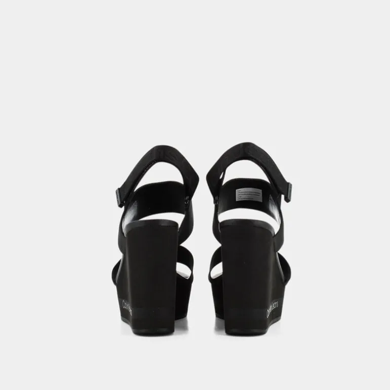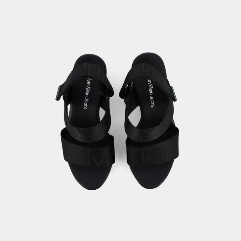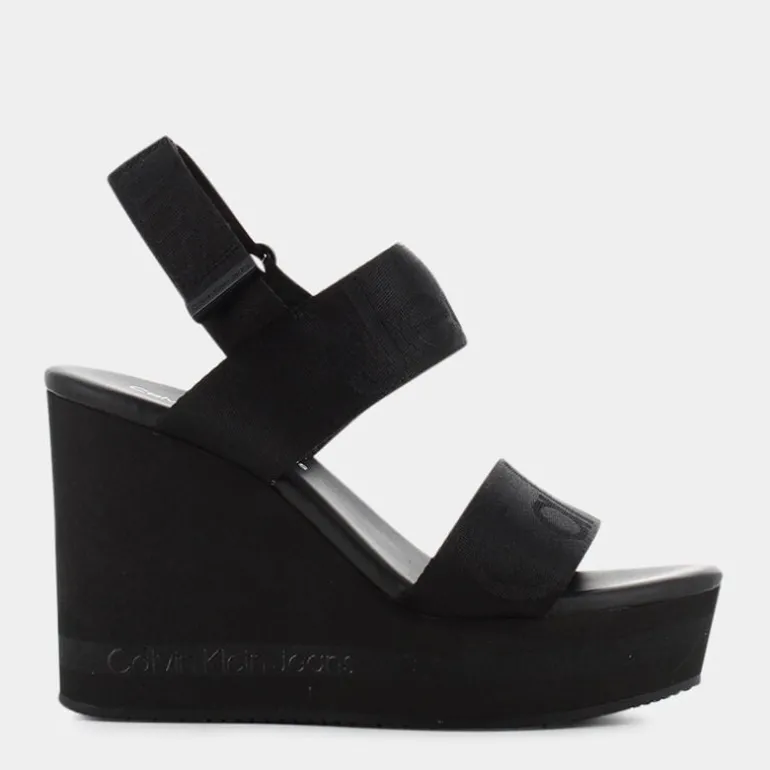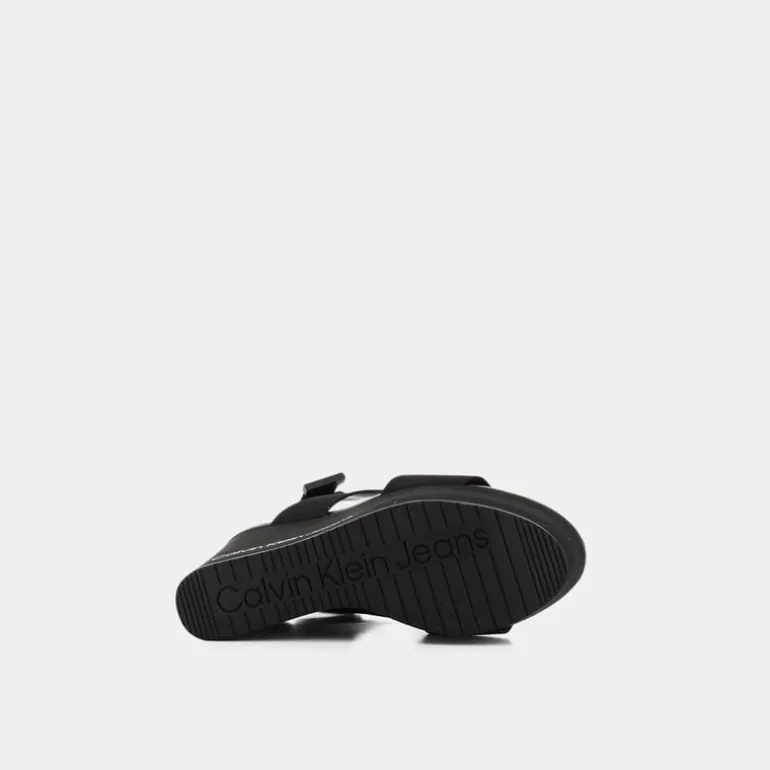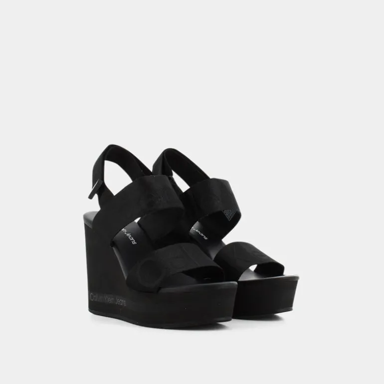 Questi sandali del marchio Calvin Klein Jeans sono caratterizzati da uno stile audace ed urbano. Realizzate con l’impiego di PET riciclato, queste scarpe fanno parte della categoria dei prodotti sostenibili e per questo motivo si schierano a sostegno dell’ambiente. La soletta presenta un dettaglio logo stampato a contrasto. Le bande superiori, come quella alla caviglia, sono tutte in tessuto riciclato elasticizzato e presentano un maxi dettaglio logo tono su tono visibile. La zeppa misura 12 cm e si contraddistingue grazie al suo look audace ed al dettaglio logo presente sul lato. Queste scarpe alla moda total-black sono perfette per essere indossate sia di giorno che di sera e, grazie alla loro versatilità, si abbinano sia ad indumenti eleganti, sia ad un abbigliamento più sportivo.