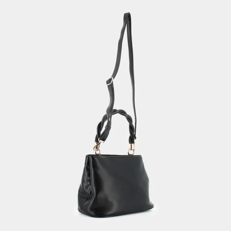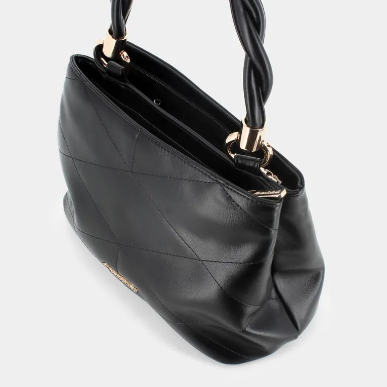 Eleganza e funzionalità si incontrano in questa borsa a mano di Marina Galanti, un accessorio imperdibile per ogni donna alla moda. Realizzata con una sofisticata lavorazione a rombi, questa borsa nera si distingue per il manico intrecciato, arricchito da anelli metallici che donano un tocco di classe e modernità. La comoda tracolla permette di indossarla anche a spalla, mentre la chiusura lampo in testa garantisce sicurezza ai tuoi effetti personali. Il design è completato da un logo metallico frontale che non passa inosservato. Con dimensioni di 29 cm di lunghezza, 20 cm di altezza e 14 cm di ampiezza, è perfetta per contenere tutto il necessario. Aggiungi un tocco raffinato al tuo outfit quotidiano con questa borsa versatile e chic.