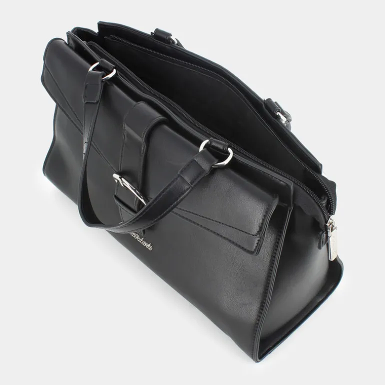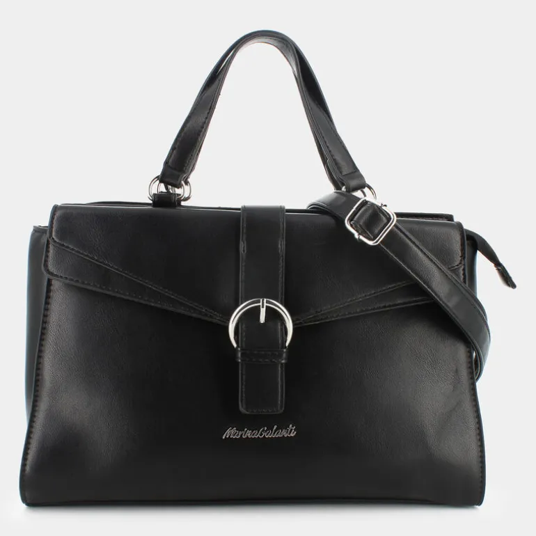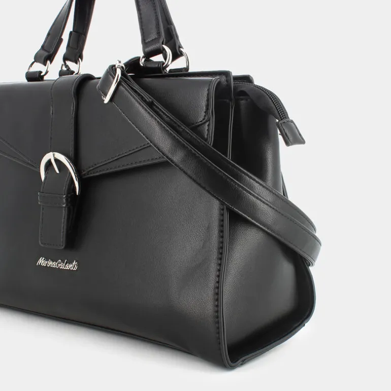 Una borsa che combina eleganza e funzionalità in un design sofisticato. La borsa nera firmata Marina Galanti è l’accessorio perfetto per le tue giornate casual. Realizzata con attenzione ai dettagli, presenta una linea classica e versatile. Le dimensioni di 33 cm di lunghezza, 21 cm di altezza e 13 cm di ampiezza offrono spazio sufficiente per contenere i tuoi essenziali quotidiani. Dotata di manici di 16 cm e tracolla aggiuntiva, garantisce comfort e praticità. Il dettaglio del logo metallico frontale e la fibbia decorativa aggiungono un tocco distintivo. La chiusura con magnete assicura sicurezza e facilità d’uso, mentre la lampo in testa offre ulteriore accessibilità. Perfetta per completare il tuo look con un tocco di classe senza sforzo.
