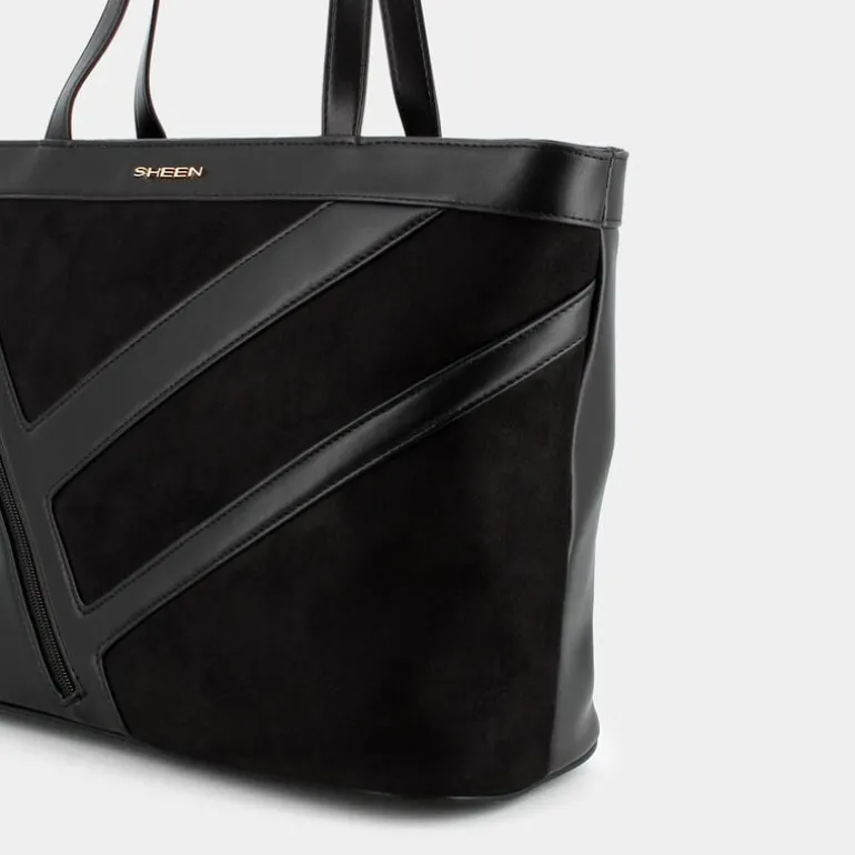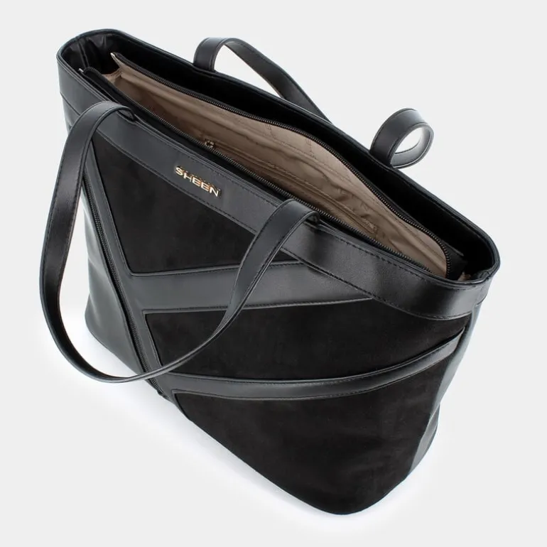 Un design sofisticato e moderno si unisce alla praticità nella borsa del brand Sheen. Con una struttura bimateriale, questo accessorio unisce ecocamoscio ed ecopelle in una raffinata tonalità nero, creando un armonioso effetto tono su tono. Le dimensioni generose di 33 cm di lunghezza, 27 cm di altezza e 14 cm di ampiezza la rendono perfetta per tutte le tue esigenze quotidiane. Il manico di 24 cm offre una portabilità comoda. Dettagli come la lampo in testa e frontale e il logo metallico aggiungono un tocco di eleganza. Questa borsa Eco Amico® è realizzata con fodera in PET al 100% riciclato, rendendola una scelta sostenibile e alla moda, perfetta per il tuo stile casual. Scegli Sheen per un’opzione di grande impatto, attenta all’ambiente.
