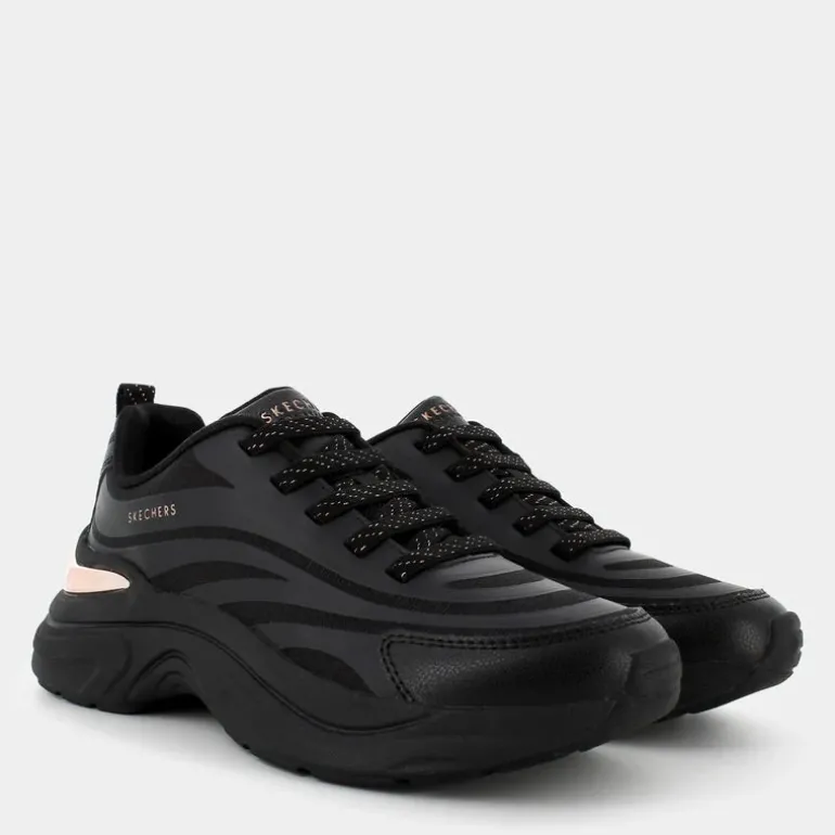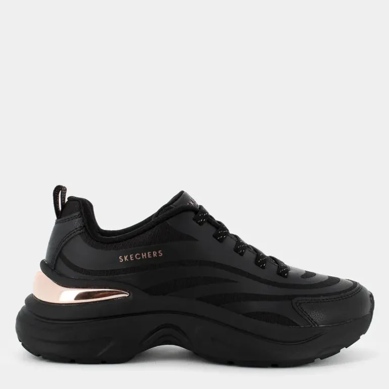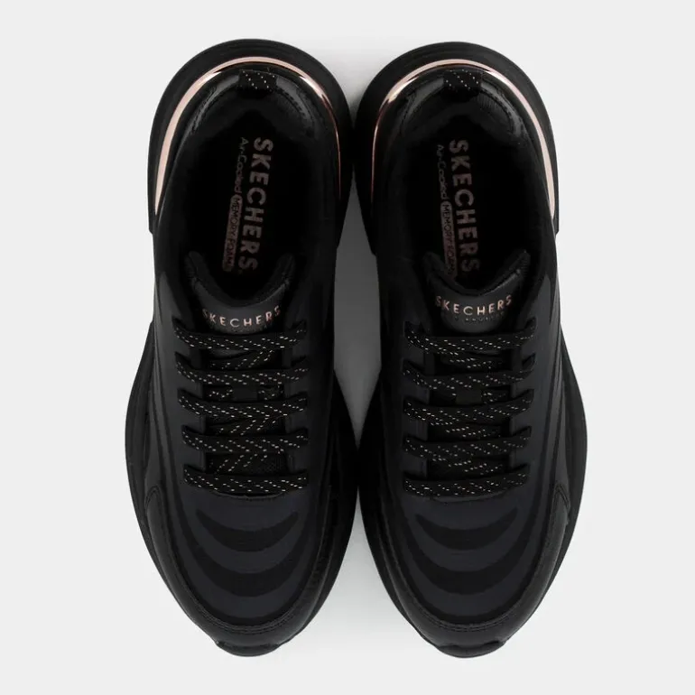 Boost your look with a trend forward statement in Skechers Street™ Hazel. This fashion sneaker features a hotmelt trimmed synthetic and mesh upper with metallic heel-cup detail, gold-flecked stretch laces, and a cushioned Skechers Air-Cooled Memory Foam® insole.