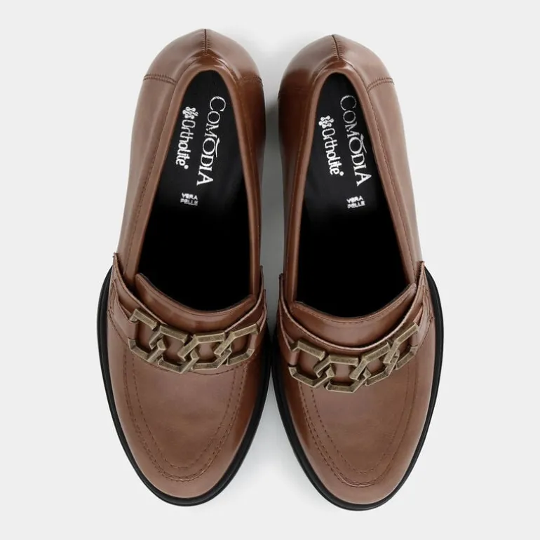 Lasciati conquistare dall’eleganza senza tempo dei mocassini con tacco Comodia. Realizzati in Italia, questi mocassini dal design classico sono perfetti per ogni occasione. L’esterno sintetico elegante e resistente si abbina perfettamente all’interno sintetico confortevole, mentre la soletta in pelle offre un’ammortizzazione superiore con la speciale tecnologia OrthoLite®. Il tacco di 8 cm aggiunge un tocco di raffinatezza, accompagnato da un accessorio con catena che aggiunge un dettaglio di stile unico. Abbinali a un tailleur pantalone o a una gonna a tubino per un look professionale, o a un abito a ginocchio per una serata speciale. Scegli l’eleganza e il comfort senza compromessi con i mocassini Comodia.