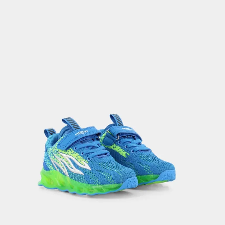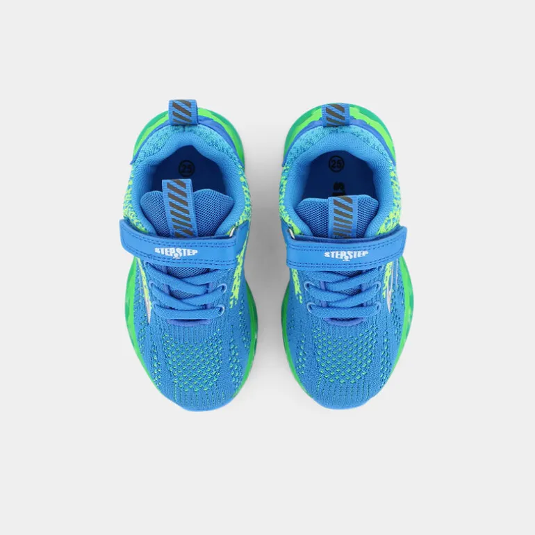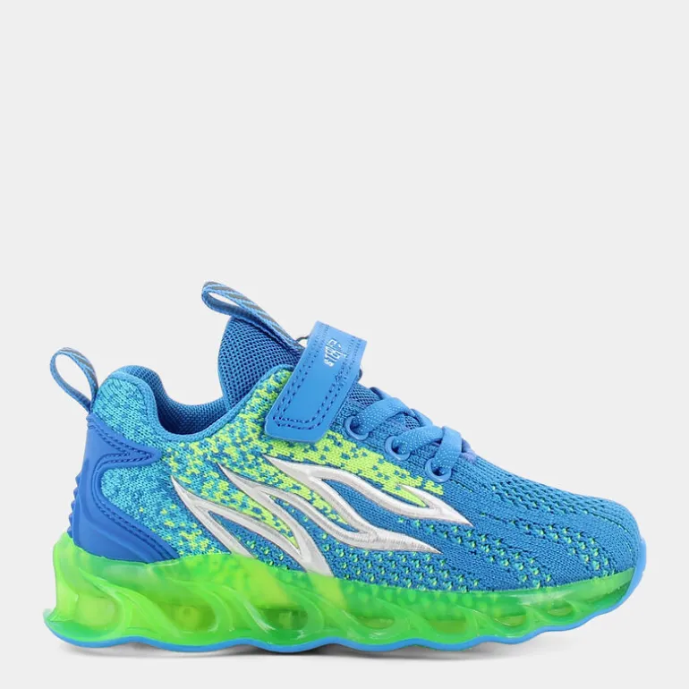 È una scarpa sportiva Step by Step – primi passi – per maschietti, realizzata secondo il progetto di sostenibilità Eco Amico. La tomaia, chiusa con lacci e velcro, è composta in mesh, una lavorazione a rete traspirante che avvolge il piedino tenendolo in posizione corretta. La soletta è in tecnologia Orholite e, come la fodera, in tessuto resistente ma morbido. La suola, in materiale compatto, aderisce al piedino con leggerezza e assicura stabilità anche sui terreni più impervi. È un’esplosione di colori brillanti: dal blu dodger della tomaia, solcato da simpatiche applicazioni bianche e verdi, al verde neon della suola dalla quale si sprigionano una miriade di lucine iridescenti. Si abbina prettamente a indumenti comodi e sportivi, ma può essere associata anche a capi di vestiario casual dalle nuance di colori in armonia.