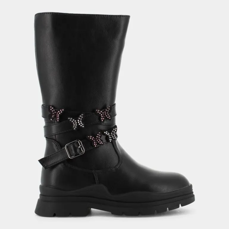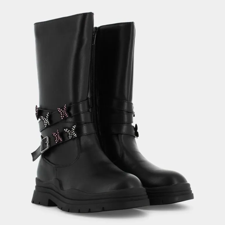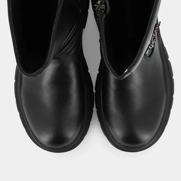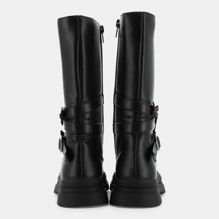 Questi scarponcini casual, in stile biker, rappresentano una soluzione estremamente versatile, adatta per tutti i contesti quotidiani in cui si muove una bambina. Il colore nero, le fibbie impreziosite da farfalle e il comfort costituiscono elementi che li rendono ideali da indossare con pantaloni di jeans, di fustagno o di cotone pesante, ma anche con gonnelline e vestiti, abbinati a collant, colorati e decorati, per un risultato più femminile. Per i genitori più sensibili ai temi di eco-sostenibilità, i processi e i prodotti utilizzati rispondono alle indicazioni dello standard internazionale ÌDEI PRODOTTI SOSTENIBILI, che assicura una lavorazione sostenibile e l’impiego di materiali riciclati, al fine di non aggravare lo sfruttamento delle risorse del pianeta. Nel caso specifico, l’approccio eco-amico garantisce: tomaia realizzata con elementi sintetici e tessuto, fodera e sottopiede in PET al 100%, suola in materiali compatti per stabilizzare il passo e soletta in tessuto.
