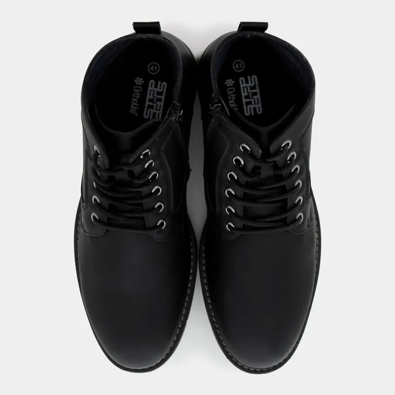 Eleva il tuo stile casual con questi scarponcini STEP BY STEP in nero, realizzati con materiali sostenibili. La tomaia in materiali riciclati riflette un impegno verso l’ambiente, mentre la fodera in PET assicura un comfort traspirante. Il sottopiede Ortholite® in PET offre un’ammortizzazione eccezionale, ideale per lunghe giornate in movimento. Perfetti per un look sofisticato e casual, questi scarponcini si abbinano splendidamente a un paio di jeans slim fit e una giacca in pelle per un tocco di eleganza urbana. Ideali anche con chino e un maglione di lana per un look più rilassato. Coniuga stile e sostenibilità con questi scarponcini Eco Amico®.
