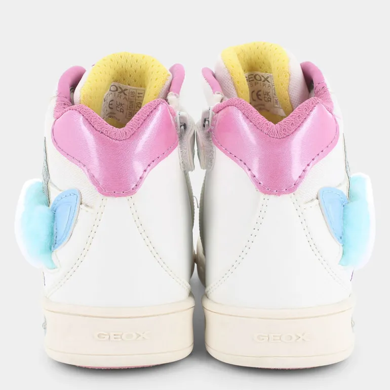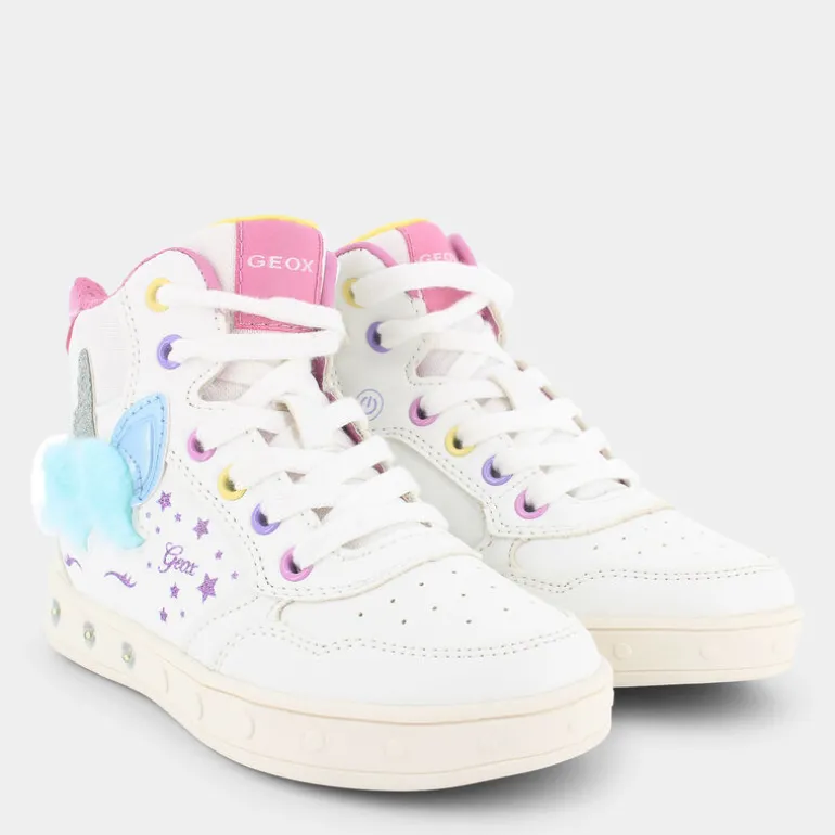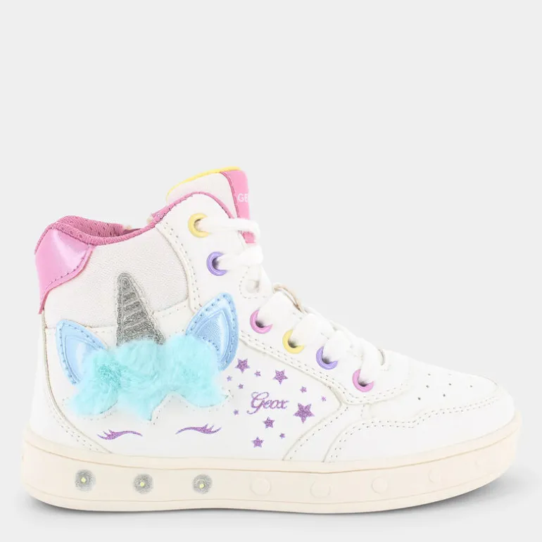 Queste scarpe sportive firmate dal marchio Geox sono apprezzatissime dalle bambine per via dello stile romantico e fantasioso. Nella suola è presente una serie di luci che assicurano ore di divertimento. Le scarpe high-top sono alla moda e sono caratterizzate da tomaia bianca, impunture tono su tono, punta arrotondata con motivo traforato, chiusura frontale con lacci piatti, linguetta imbottita di colore rosa con dettaglio logo ricamato a contrasto, suola in gomma tono su tono, logo e ricami decorativi sul lato a forma di stella, inserto a contrasto posteriore, imbottitura alla caviglia e particolare applicazione a forma di unicorno sul lato, con rilievo in peluche e dettaglio metallizzato. Queste sneakers sono perfette per accompagnare le piccole nei loro momenti di gioco.