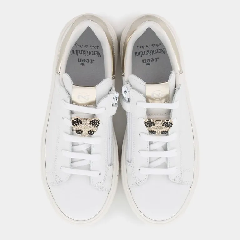 Ravviva il look della tua bambina con queste sneakers bianche firmate Nero Giardini, perfetta fusione di stile e comfort. Realizzate interamente in pregiata pelle, sia all’esterno che all’interno, offrono una confortevole esperienza d’uso grazie anche alla soletta in pelle. La zeppa discreta aggiunge un tocco di eleganza senza rinunciare alla praticità. Made in Italy, queste sneakers incarnano la qualità artigianale italiana. Il dettaglio del laccio aggiunge un tocco di classe e permette una calzata regolabile e sicura. Perfette per un look casual, queste sneakers si abbinano perfettamente a un abito colorato o a jeans e maglietta per un outfit sempre alla moda e confortevole. Lasciati conquistare dal fascino intramontabile di queste sneakers!