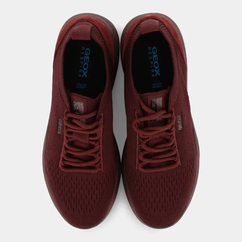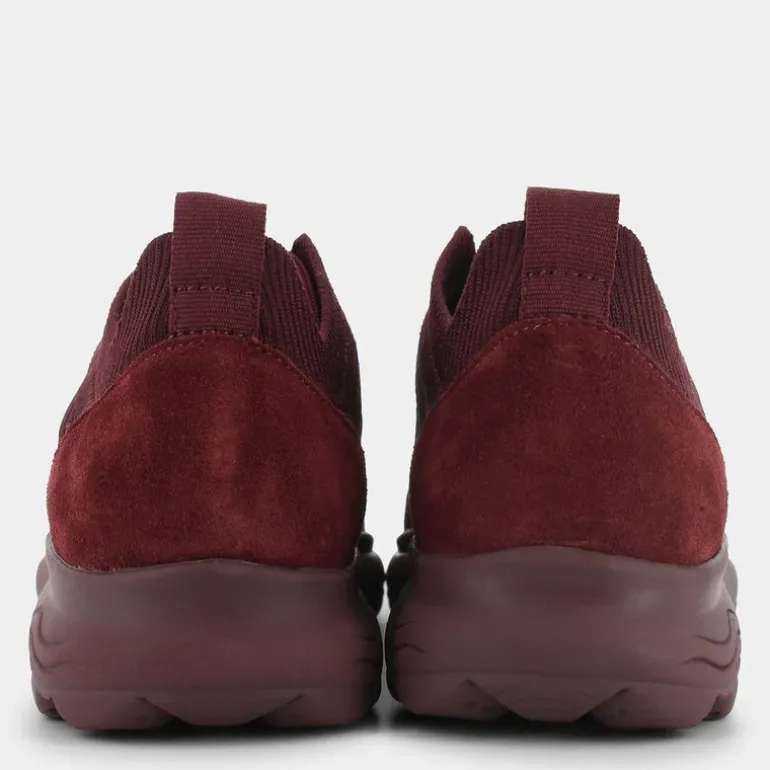 Le sneakers alla moda firmate dal marchio Geox sono perfette per essere indossate sia di giorno che di sera, durante la stagione autunno/inverno. Il brand sceglie per queste scarpe un componente altamente innovativo: la suola Spherica. Grazie alla presenza di speciali sfere ammortizzanti incastonate al suo interno, questa speciale suola in gomma consente di attutire eventuali urti, camminando in totale sicurezza e comodità. Il design delle sneakers casual Geox è caratterizzato da tomaia in tessuto texturizzato di colore rosso scuro, punta a mandorla, chiusura frontale con coulisse, linguetta imbottita con patch logo in rilievo, dettaglio logo ricamato sul lato, imbottitura alla caviglia e linguetta pull-on posteriore. La suola è realizzata in gomma bordeaux e comprende una zeppa di 3 cm.