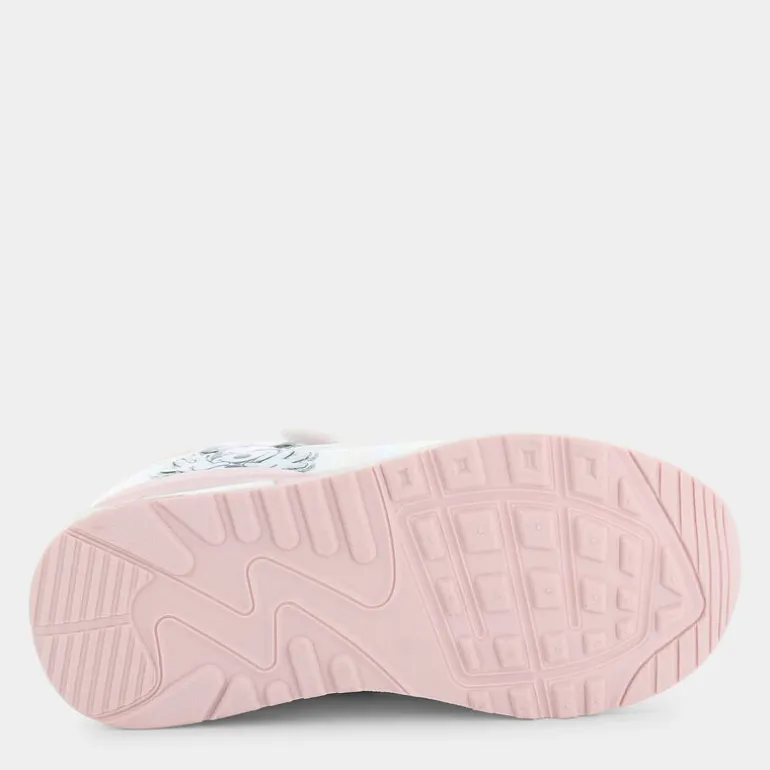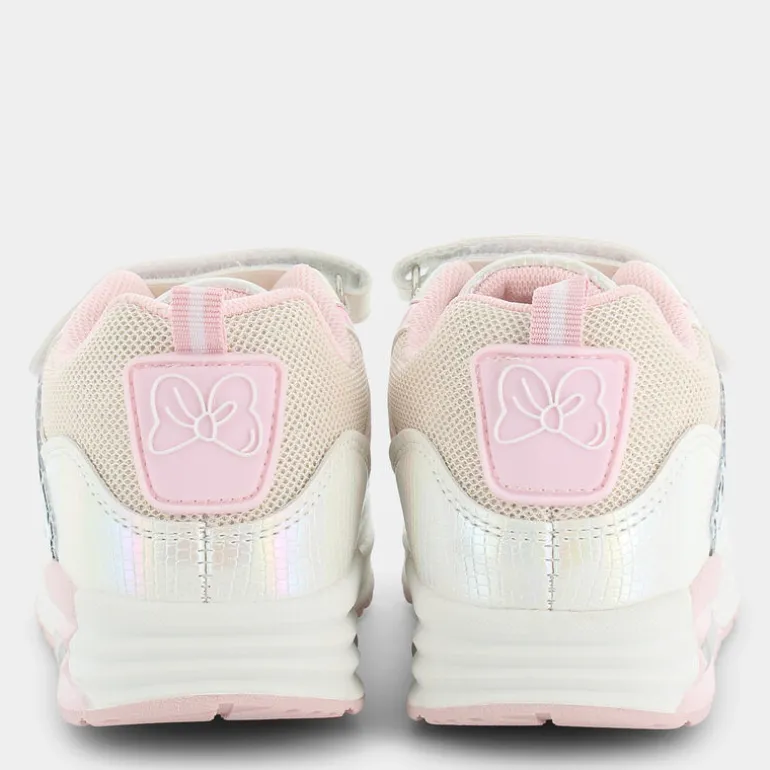 Le scarpe da bambina di Minnie si presentano in bianco, che viene però arricchito e reso particolare da un effetto olografico. A contatto con i riflessi della luce, infatti, le scarpe risultano luminose, quasi come se brillassero. Questo dettaglio è una caratteristiche che più piacerà alla tua bimba. I dettagli rosati sui lacci e sul bordo delle calzature rendono il tutto ancora più delicato. Inoltre, rosa è anche la scritta Minnie sulla chiusura a strappo delle scarpette. Sono presenti i lacci proprio per dare maggiore stabilità al piede, permettendo di fare qualsiasi attività: andare all’asilo, uscire al parco e giocare oppure fare un giro tranquillo. Sul retro delle scarpe è presente una targhetta con le orecchie di Minnie, che farà sentire la bambina che le indosserà all’interno di una fiaba. A rendere ancora più speciali le sneakers sportive di Topolina sono le luci sulla suola, che si accenderanno a ogni passo.