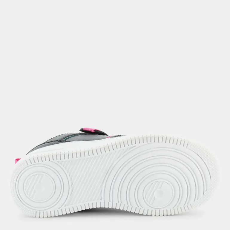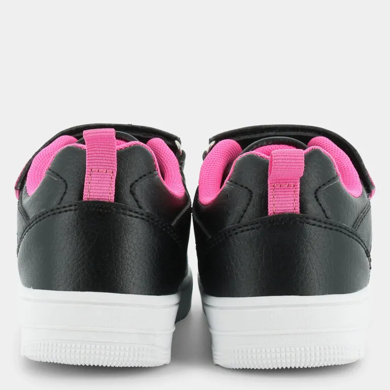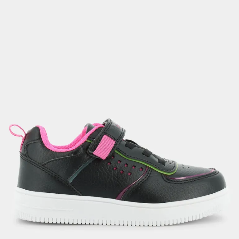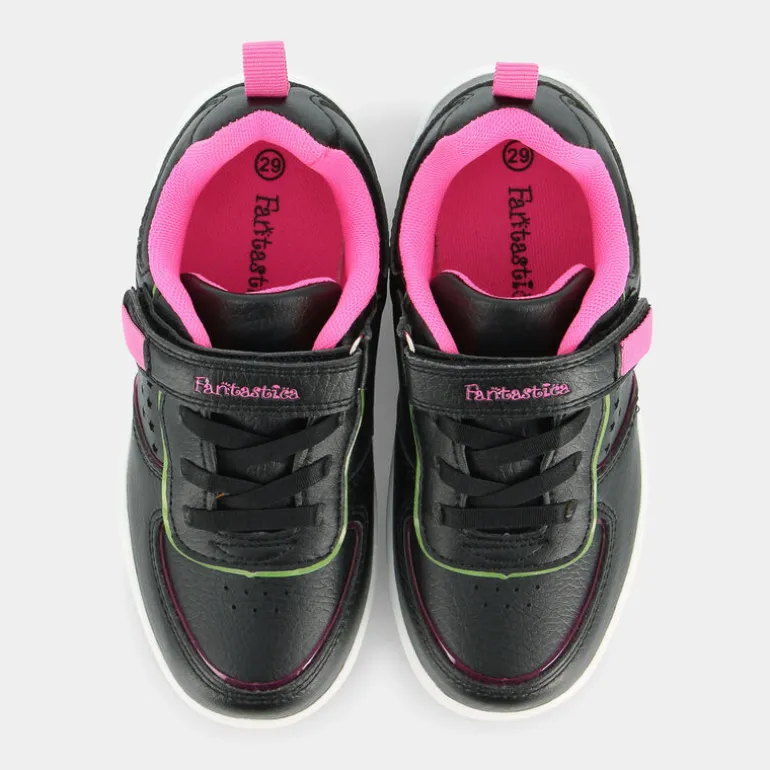 Le scarpe sportive firmate dal marchio Fantastica sono perfette per accompagnare le più piccole in ogni loro avventura. Per la realizzazione della fodera e del sottopiede di queste sneakers, il brand sceglie di impiegare esclusivamente PET 100% riciclato e certificato GRS. Per questo motivo, l’articolo rientra nella categoria prodotto EcoAmico, rispettando l’ambiente. Il design delle scarpine comprende punta arrotondata, tomaia di colore nero con piccoli fori a forma di stella sul lato, finiture a contrasto lungo le impunture principali, linguetta imbottita, chiusura frontale con lacci piatti, chiusura superiore a strappo con dettaglio logo ed imbottitura alla caviglia. Sul retro è ricamata anche una comoda linguetta pull-on di colore rosa, utile per aiutare le bambine ad inserire il piede nella scarpa.