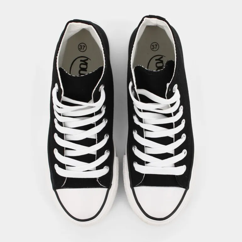 "Le sneakers alte da donna YOUSM sono una scarpa sportiva dalle linee semplici e senza tempo. La tomaia in tessuto garantisce traspirabilità e freschezza. La chiusura a lacci regolabili offre stabilità al piede. La suola ammortizzante dona un comfort prolungato. La fodera e il sottopiede invece sono stati realizzati con materiali al 100% riciclati la cui produzione a basso impatto ambientale, rendendo questo prodotto ecologico."