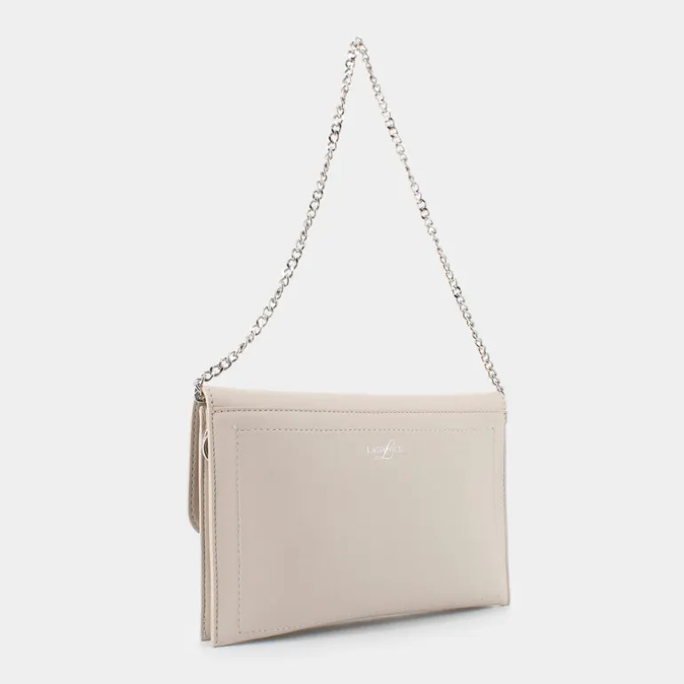 La clutch di **Lady Nice**, realizzata con maestria in Italia, è l’essenza della raffinatezza per le occasioni più eleganti. Questo accessorio di colore beige, con le sue dimensioni di 17cm di altezza, 26cm di lunghezza e una sottile ampiezza di 5cm, incarna la perfetta armonia tra stile e funzionalità. Dotata di una tracolla in metallo di 55cm, ti permette di indossarla con eleganza o di trasportarla come una pochette, adattandosi con discrezione e grazia al tuo look. La patina delicata e la chiusura con staffa svelano un design attentamente curato, ideale per serate di gala, cerimonie e ogni evento dove l’eleganza è di rigore. Con la sua tracolla metallica e accenti di catena, questa clutch **Lady Nice** esprime un lusso sottile, promettendo di illuminare la tua presenza con un tocco di classe sofisticata.